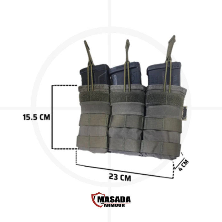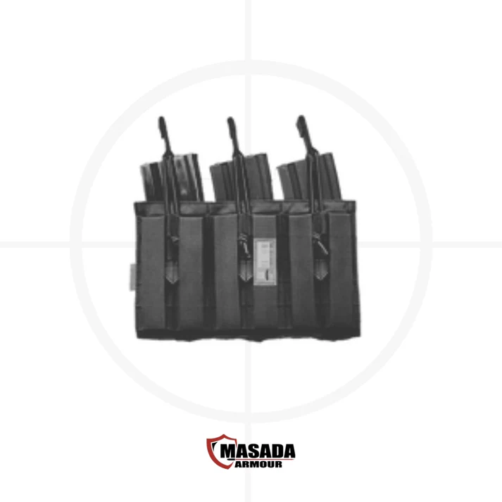 פאוץ’ משולש קל ועמיד מבית Masada Armour, המיועד לנשיאה יעילה ונוחה של מחסניות בשטח. מתאים למחסניות אקדח בקוטר 9 מ״מ ולמחסניות M4 בקוטר 5.56. מאפשר התקנה על חגורת לוחם או על מערכת MOLLE לשליפה מהירה וניהול עומס מאוזן במהלך פעילות מבצעית. זמין בצבע שחור ובצבע ירוק טקטי. תוצרת ישראל.